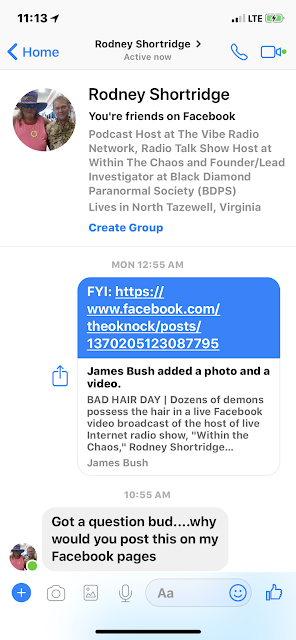 While watching a replay of a video made live earlier today posted on Facebook by the host of "Within the Chaos"—the same Internet radio show on which I appeared as a guest [see Excerpts from my guest appearance on live Internet radio]—I noticed about two dozen demon heads in Rodney's hair. Here are two of them: