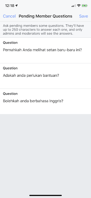 | Applicants to The Life of a Demoniac | Indonesia Facebook Group are asked a series of questions in their native language prior to group membership in order to identify those with a legitimate interest in the group's topic and entertainment-seekers |